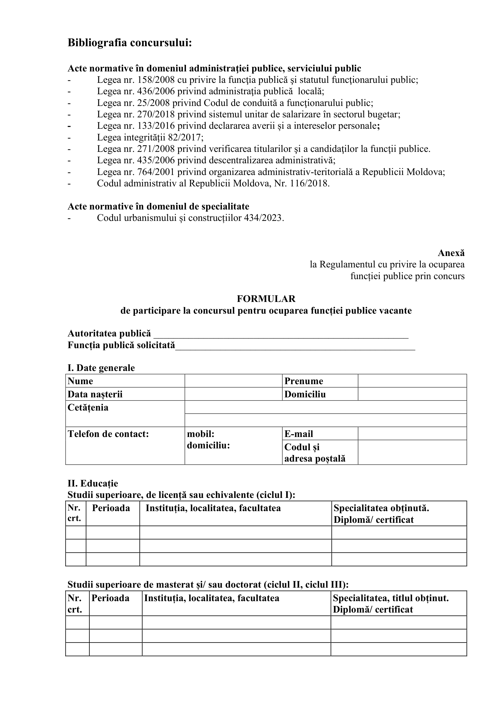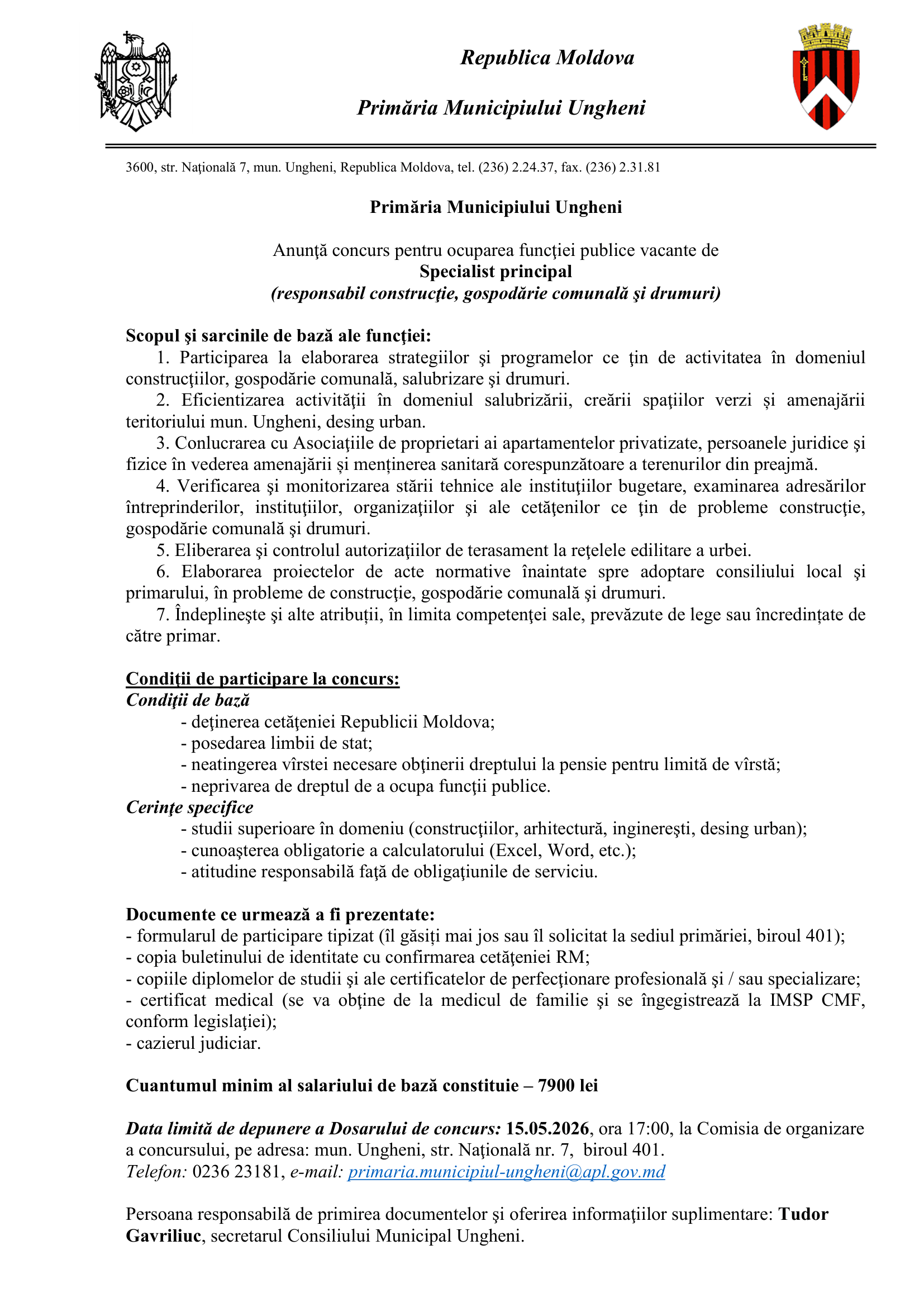 Anunţ concurs pentru ocuparea funcţiei publice vacante de Specialist principal (responsabil construcţie, gospodărie comunală şi drumuri)